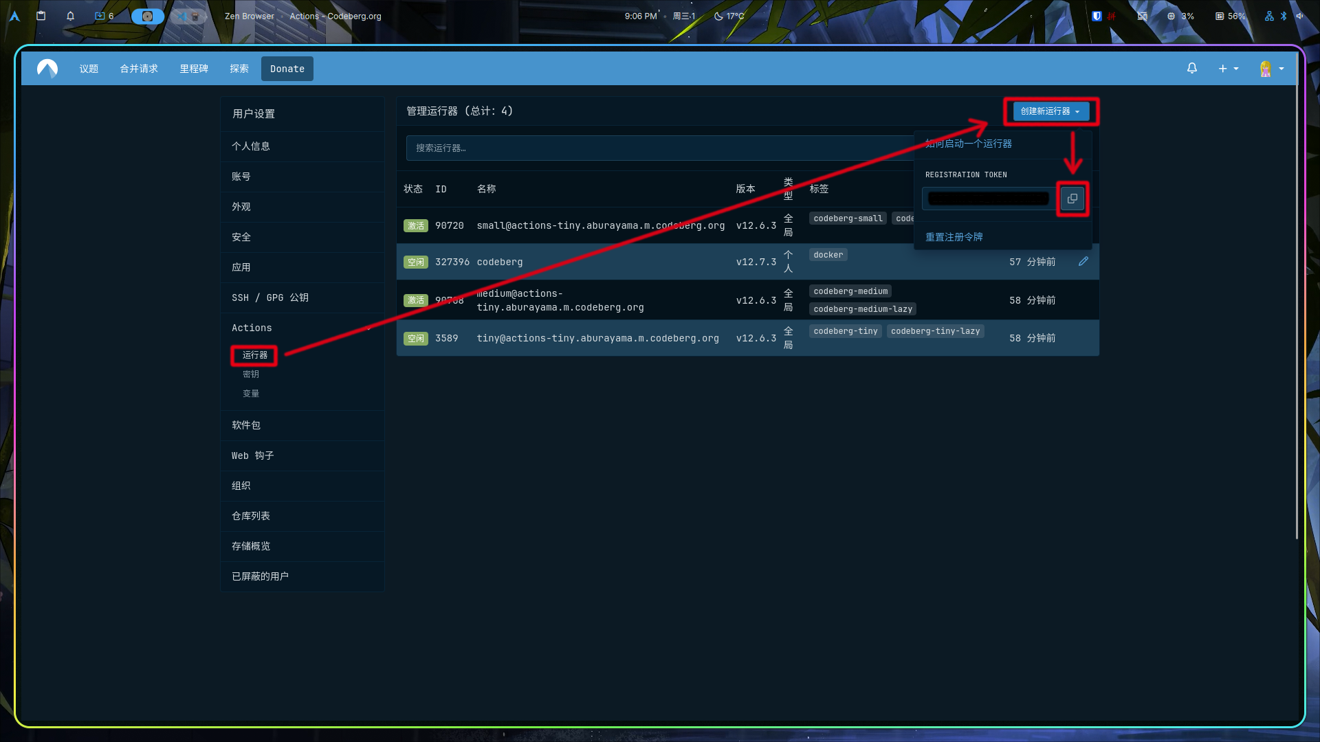 要连接到CodeBerg,我们首先拿到一个Token。在设置 -> Actions -> 运行器 -> 创建新运行器 可以找到你的Token。
