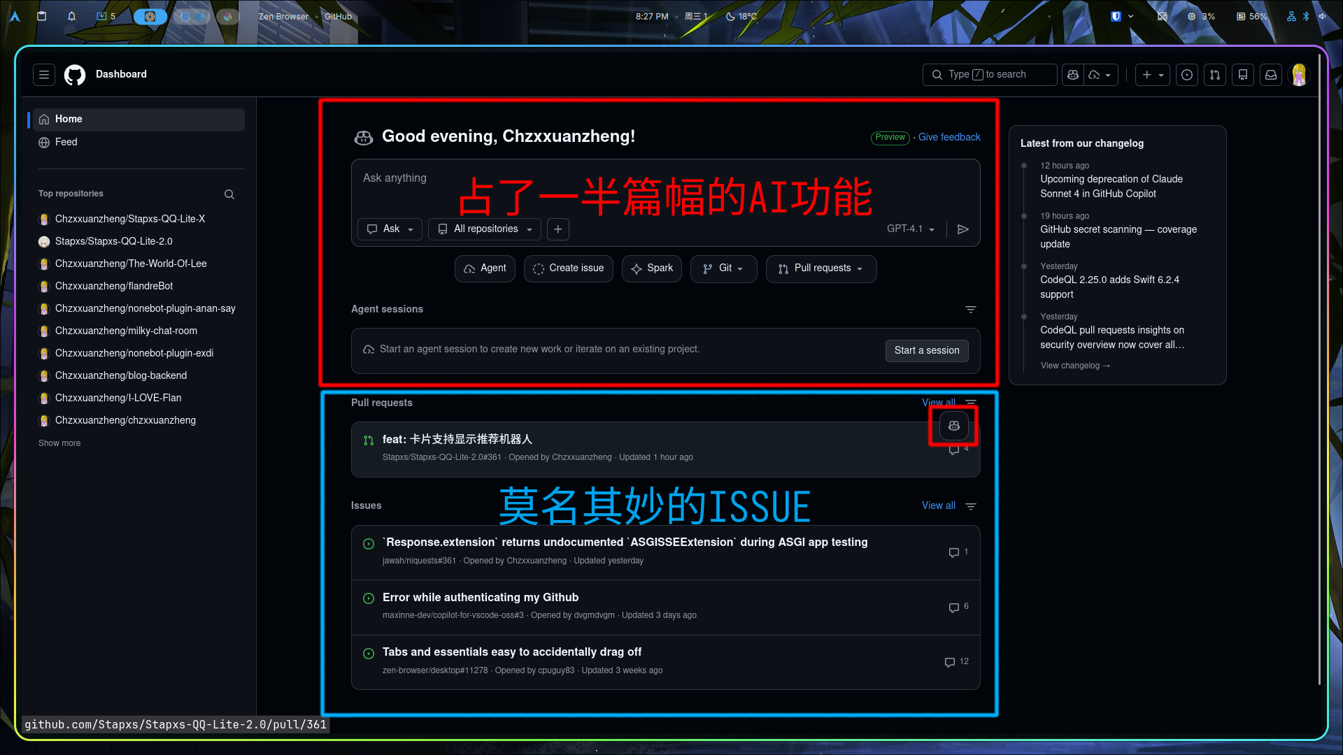 作为一个Git托管平台,GitHub主页的一半篇幅是AI聊天框,另一半是你最近的Issue与Fork。